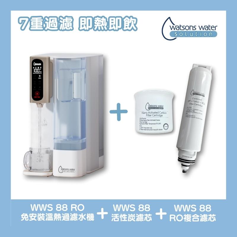 屈臣氏 WWS 88 RO免安裝溫熱過濾水機+專用活性炭濾芯1個+專用PP活性炭棒及RO複合濾芯1個