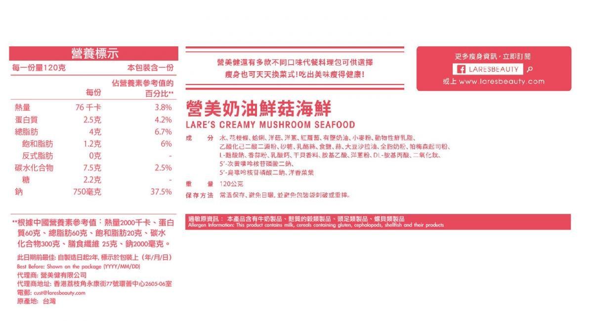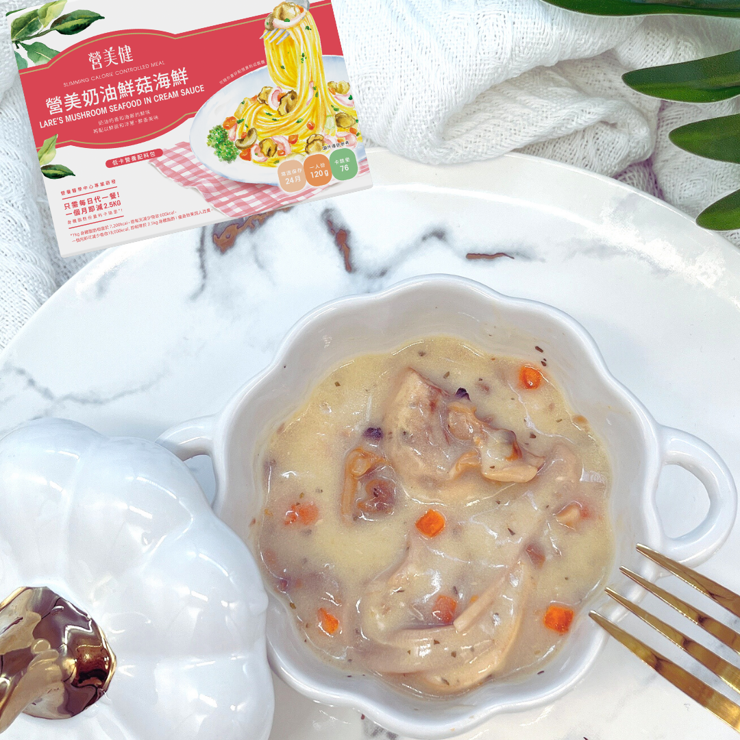 無需冷藏,加熱即食 乳香而不膩的奶油醬汁,突出海鮮鮮味;滑滋滋的醬汁包裹粒粒洋蔥、鮮菇,咬落爽口清新 一盒食量只有76kcal 產地:台灣