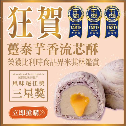 師傅手工捏製千層外皮,口感香酥綿密,嚴選大甲檳榔心芋製作芋頭餡,每一顆芋頭去蕪存菁,口感扎實飽滿,一口咬下,飽滿的奶黃流芯餡傾洩而出,爆漿口感令人愛不釋手