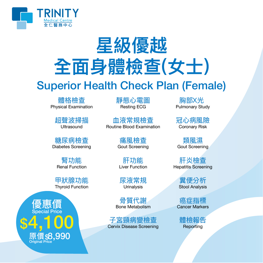 星级优越全面身体检查 (女士)适合30岁或以上女士,助你了解体内各项机能表现,持续观察如三高、糖尿及心血管健康指数。 更特别针对女士乳房、卵巢及子宫健康,助你及早发现相关病症作出预防或治疗。亦针对骨质疏鬆及各项癌症进行风险评估。
