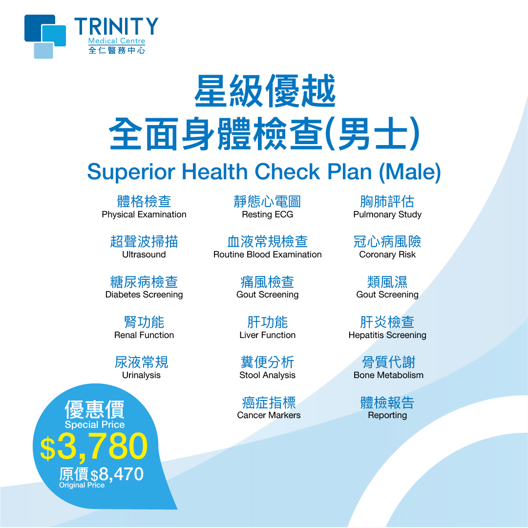 星级优越全面身体检查 (男士) 适合30岁或以上男士。助你了解体内各项机能表现,持续观察如三高、糖尿及心血管健康指数。 更特别针对男士前列腺及肾脏健康,助你及早发现相关病症作出预防或治疗。亦针对骨质疏鬆及各项癌症进行风险评估。